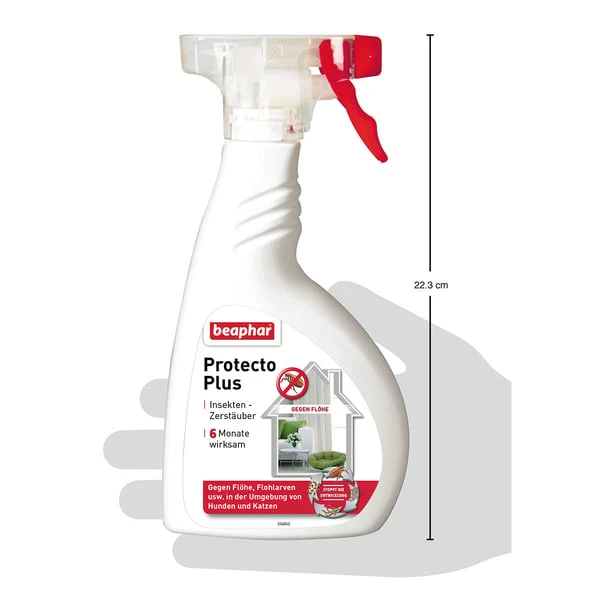 Beaphar Protecto Plus ein raumgreifender Zerstäuber mit doppeltem Wirkprinzip: Ausgewachsene Flöhe sterben sofort ab. Die Entwicklung vom Ei zur Larve wird durch den Wirkstoff S-Methopren gestoppt. Dadurch wird die Vermehrung der Flöhe verhindert. Das (un)sichtbare Problem. Die Anzahl der sichtbaren Flöhe ist nur die Spitze des “Flohbergs”. Lediglich ca. 5 % einer Flohpopulation leben auf dem Wirt. Die übrigen 95 % verteilen sich als Eier, Larven oder Puppen unsichtbar in der Umgebung ihrer Wirtstiere, weshalb auch die Umgebung mit entsprechenden Produkten behandelt werden sollte. Protecto Fogger (Vernebler) wirkt auch gegen Zecken, Läuse, Herbstgrasmilben, Haarlinge, Kakerlaken usw.
