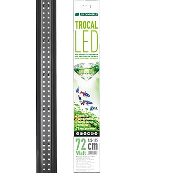 Wenn Sie sich für die Trocal LED von Dennerle entscheiden, wählen Sie eine Süßwasseraquarien-Leuchte mit der höchsten Leistungsdichte ihrer Klasse: Überzeugend auf ganzer Linie! Sie ist für alle Süßwasser-Aquarien geeignet und weist durch die hochwertigen Cree-LEDs auf Kühl-Keramik eine besonders lange Lebensdauer auf. Zudem besitzt sie eine sehr hohe Leistungsdichte (54 W/m bzw. 5.040 lm/m): Sehr effizient und somit energie- und kostensparend. Übrigens ersetzt eine Trocal LED ganze zwei T5-Röhren. Im Gegensatz zu vielen anderen LED Leuchten blendet diese bei normaler Betrachtungsweise des Aquariums nur kaum.