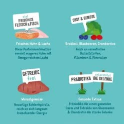 Frisches Huhn 35%, Süßkartoffeln, Erbsen, frischer Lachs 5%, Leinsaat, Erbsenprotein, Hühnersoße, Mineralstoffe, Mannan-Oligosaccharide (MOS), Fructo-Oligosaccharide (FOS), Brokkoli 0,04%, Blaubeeren 0,04%, Preiselbeeren 0,04%, Cranberrys 0,04%, Grünkohl 0,04%, Maca 0,04%, Ringelblumenblüten, Nesseln, Brombeerblätter, Fenchel, Kümmel, Kamille, Melisse, Glucosamin, Chondroitinsulfat.