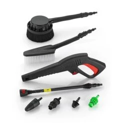 - Viel Zubehör inklusive: Pistolengriff, Lanze, Druckschlauch ca. 8 m, Reinigungsbürste, rotierende Reinigungsbürste, Hochdruckdüse, Turbodüse, Reinigungsmitteldüse, Ecodüse, Wasseranschluss mit Siebeinsatz