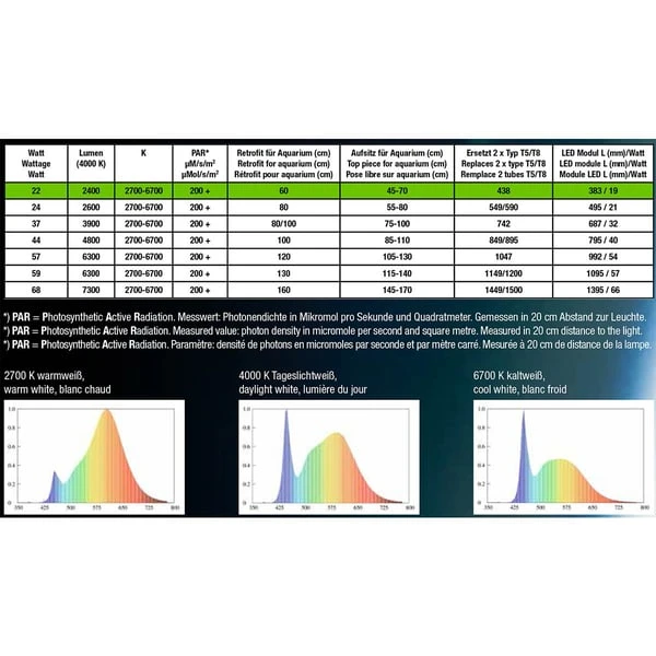 | Model | 22 W, 438 mm | 24 W, 549/590 mm | 37 W, 742 mm | 44 W, 849/895 mm | 57 W, 1047 mm |