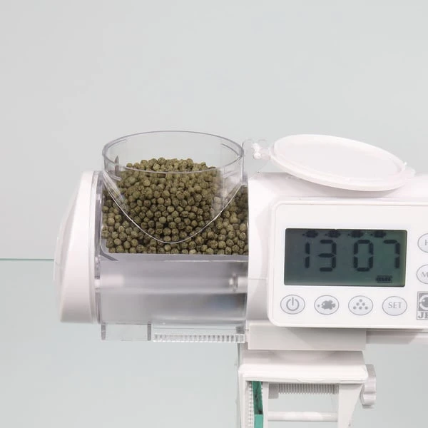 Praktischer Futterautomat: Automatische Fütterung von Aquarienfischen – Für alle Granulate von 1,0 bis 3,0 mm. Einfache Programmierung: Bis zu 4 x tägliche Fütterung mit individuellen Futtermengen. Befüllbar mit 125 ml Futter und erweiterbar durch Aufschrauben einer 250 ml Futterdose auf 375 ml. An/Aus-Schalter für manuellen Betrieb, einfaches Verstellen von Futterzeiten und Menge. Mit Adapterring für JBL PRONOVO-Dosen 250 ml. Luftanschluss zur Futtertrocknung, universelle Befestigung durch Sauger oder Halterklammer (360° Drehbarkeit auf der Halterung). Lieferumfang: Futterautomat für Aquarienfische mit Halterungen und 3 x 1,5 V AA Batterien und Adapaterring für 250 ml JBL PRONOVO Dosen.
