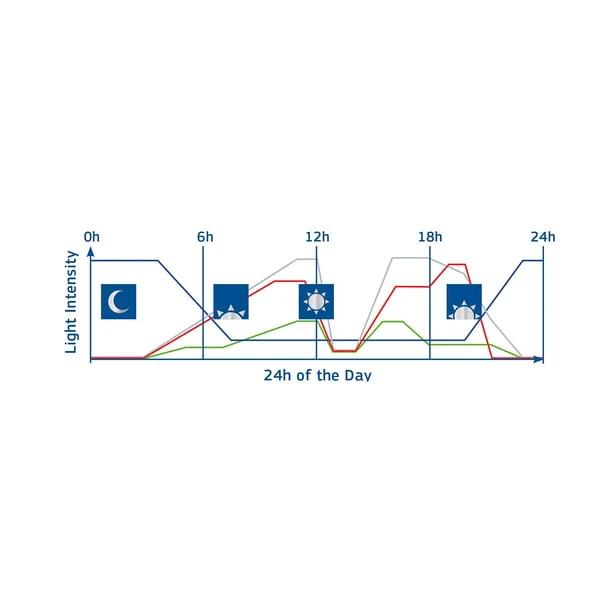 DayControl: Individueller Tagesablauf ganz nach Ihren Wünschen und Bedürfnissen. 16 einstellbare Lichtphasen erlauben es nicht nur Morgendämmerung, Sonnenaufgang, Sonnenuntergang und Abenddämmerung einzustellen, sondern tagsüber noch weitere Lichtveränderungen individuell zu programmieren. Darüber hinaus kann eine Mittagspause zur gewünschten Uhrzeit und Lichtintensität definiert werden. Die frei einstellbaren Farbkanäle ermöglichen auch das gezielte Einstellen individueller Mondscheinbeleuchtung.