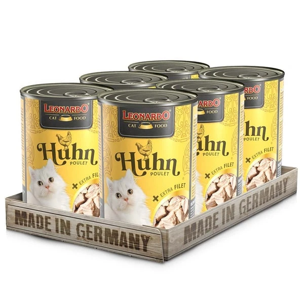 56% Hühnerfleisch, -leber, -herz, -muskelmagen; 28,8% Fleischbrühe; 14% Hühnerfilet; 0,5% Mineralstoffe; 0,5% Eierschalen, getrocknet; 0,2% Lachsöl