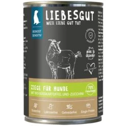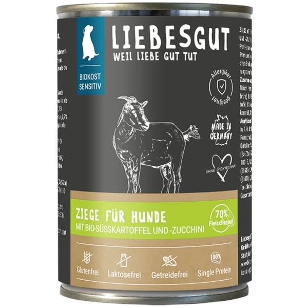 70% BIO-Ziege (Muskelfleisch, Herz, Lunge), BIOZiegenfleischbru?he, 15% BIO-Zucchini, 13% BIO-Su?ßkartoffel, 1% BIO-Nachtkerzenöl, 1% BIO-Eierschale