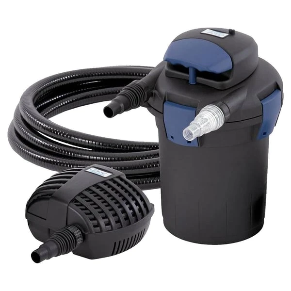 An den Filter, fertig, los: Das BioPress Set 10000 ist ideal fĂŒr jeden Start Up – Teichbesitzer, denn das Komplettset inkl. 5 m Schlauch ist ganz einfach eingebaut und angeschlossen. Es zeichnet sich besonders durch seine effektive Filterleistung aus, denn die im Set enthaltene 70 Watt Filterpumpe, der Druckfilter und das darin integrierte 11 Watt UVC-VorklĂ€rgerĂ€t sind perfekt aufeinander abgestimmt. Teiche bis zu 10 mÂł (bei Fischbesatz bis zu 5 mÂł) erhalten garantiert klares Wasser, das sogar zu einem höher gelegenen Bachlauf befördert werden kann. Verschmutztes Wasser wird mit einer Leistung von 3400 l/h zum Filter transportiert. Seine einfache, patentierte Handhabung ĂŒberzeugt, denn Ihre HĂ€nde bleiben sauber beim Reinigen der FilterschwĂ€mme, deren Verschmutzung sogar auĂen angezeigt wird. Und damit keiner den Filter sehen kann, lĂ€sst der sich fast komplett eingraben. Vertrauen Sie auf OASE-QualitĂ€t: Sie erhalten 2 Jahre Garantie plus eine Klarwassergarantie.