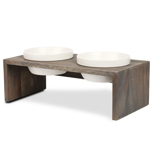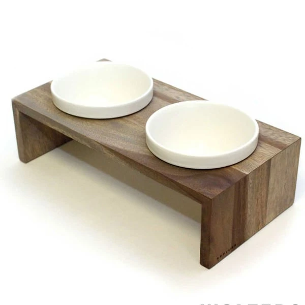 Der Gohan Doppelnapf aus Vollholz besticht durch sein Stylisches Design, urwüchsig und mit rauem Charme. Die runden Porzellanschalen können in der Spülmaschine gereinigt werden. Die runden Porzellanschalen liegen einfach in den Öffnungen. Ein etwas stärkerer Rand hält sie an ihrem Platz. Kleine Silikonpunkte verhindern ein Verrutschen oder Kippeln des Napfes. Gleichzeitig sorgen sie für einen ausreichenden Abstand zwischen den Porzellanschälchen und dem Holzrahmen, wodurch Wasserflecken deutlich minimiert werden.