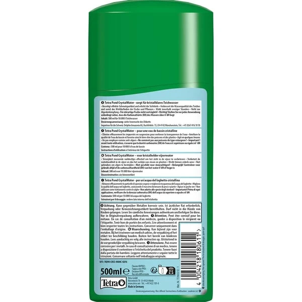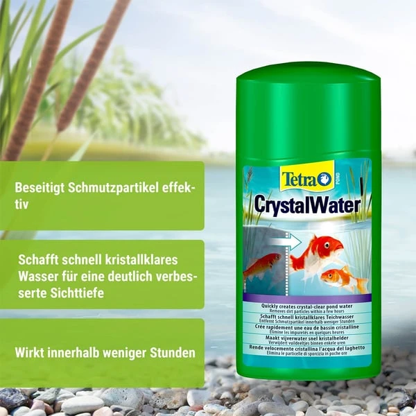 Tetra Pond CrystalWater beseitigt effektiv Schmutzpartikel im Gartenteich. Innerhalb weniger Stunden bindet es mineralische Trübungen, die durch Pflanzenerde oder durch Fischausscheidungen, Futterreste oder abgestorbenes pflanzliches Material verursacht werden. Die Wirkstoffe flocken mit ihrer umweltverträglichen Wirkungsweise die Schmutzpartikel im Teichwasser aus. Danach können sie mechanisch oder durch den Filter leichter entfernt werden. Die Wasserqualität und somit auch das Wohlbefinden der Fische und der Pflanzen werden so verbessert.
